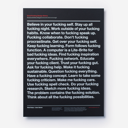 In 2010, two grad students got together over one cup of coffee and six cheap beers to create a profanity laden text-based website that would make basic design principles impossible to forget for their students. Within days, after only sharing the site with a few friends, goodfuckingdesignadvice.com had received 70,000 visits. Within weeks, that number rose into the millions, and a small army of new fans were demanding posters and T-shirts. A fucking business was born.